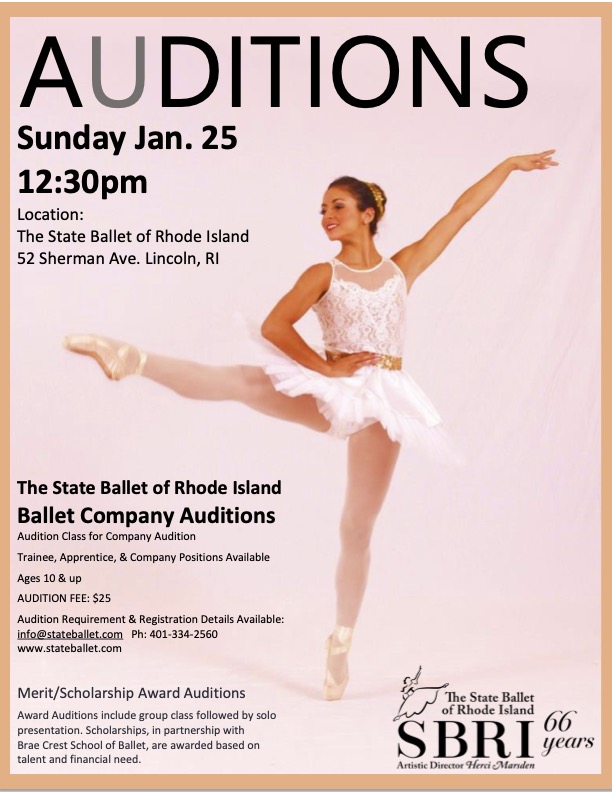 Mark your calendars for Sunday, January 25th, for The State Ballet of Rhode Island’s annual company auditions! Auditions are also held for training scholarships and merit awards in partnership with Brae Crest School of Ballet. The process includes a group class followed by a solo presentation, with scholarships awarded based on talent and financial need.